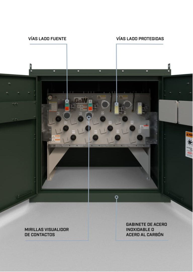 El seccionador se fabrican en sumergibles o pedestal, en tensiones 15, 27 y 38 KV, de 2 a 6 vías, con tanques de acero inoxidable y gabinete de acero inoxidable o al carbón.