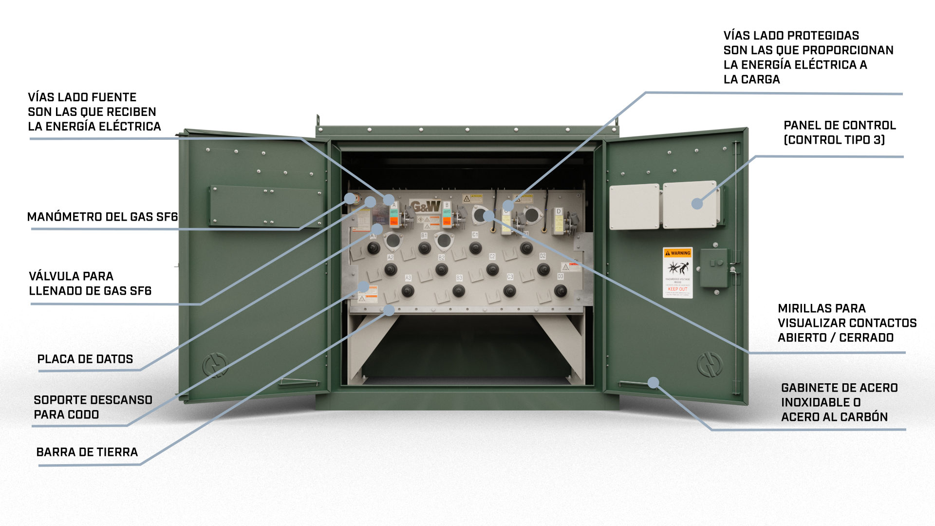 Los seccionadores GW son equipos que se instalan en redes su función principal es la de abrir o cerrarun circuito en condiciones de operación normal o de falla, interrumpiendo corrientes nominales, de sobrecarga y de corto circuito.